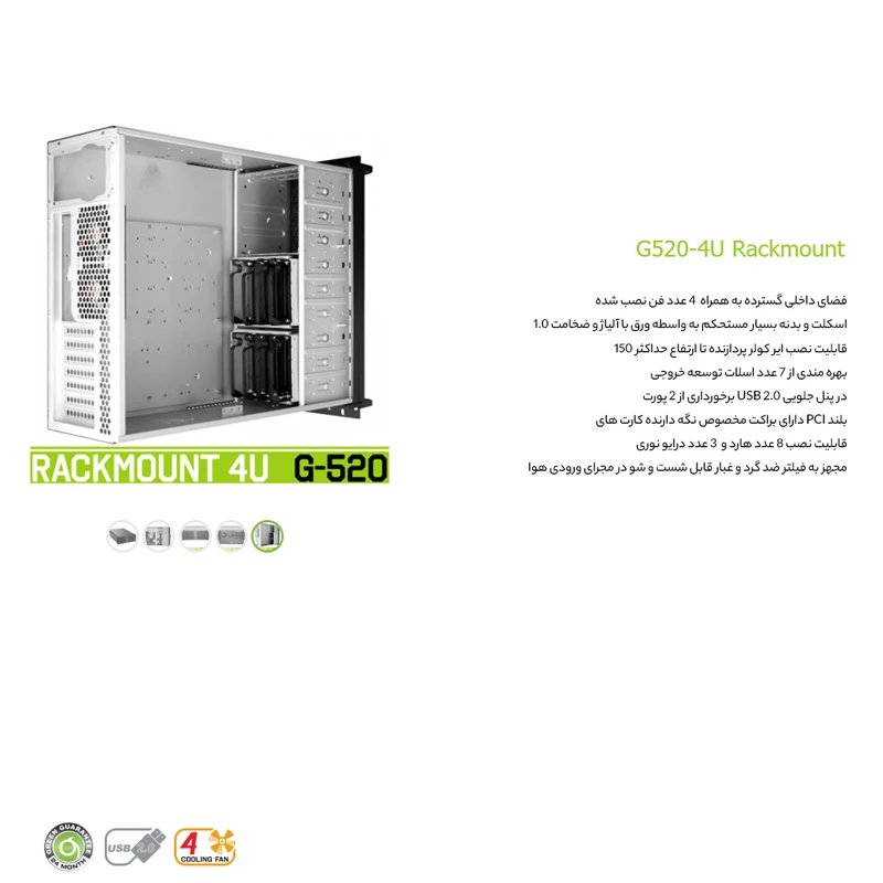 کیس کامپیوتر افقی گرین مدل G520 4U، سازگار با مادربردهای ATX، E-ATX، microATX، SSI CEB و SSI EEB، دارای 4 فن از پیش نصب شده